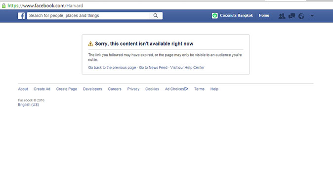 Facebook users in Thailand are either redirected to their Facebook home page or to an error message reading “Sorry, this content isn’t available right now” when they try to access Harvard University’s Facebook page.