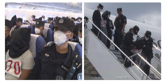 ABOVE: Chinese state media broadcast images on July 11 of the Uighurs deported from Thailand, showing them being transported in black hoods and alleging some have ‘terrorist links.’ Photo: CCTV