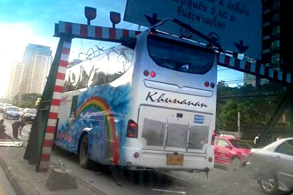 Downtown Bangkok traffic was paralyzed this morning after a double decker bus got stuck at a 2.6-meter height limit barrier on a bridge across the Asoke-Petchaburi Intersection.