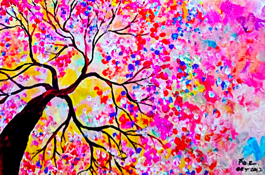 “I love the skies, the trees, their branches, and the moon and the sun,” Suthirak said. “They make me feel the freedom of life. The colors of the sky represent my love and passion for each of my paintings. The branches of each tree are alive, complicated but beautiful. The sun and the moon are the beauty of nature and I see them with my own colors and style. They are all in my mind — they are places in my dreams that I want to visit.”