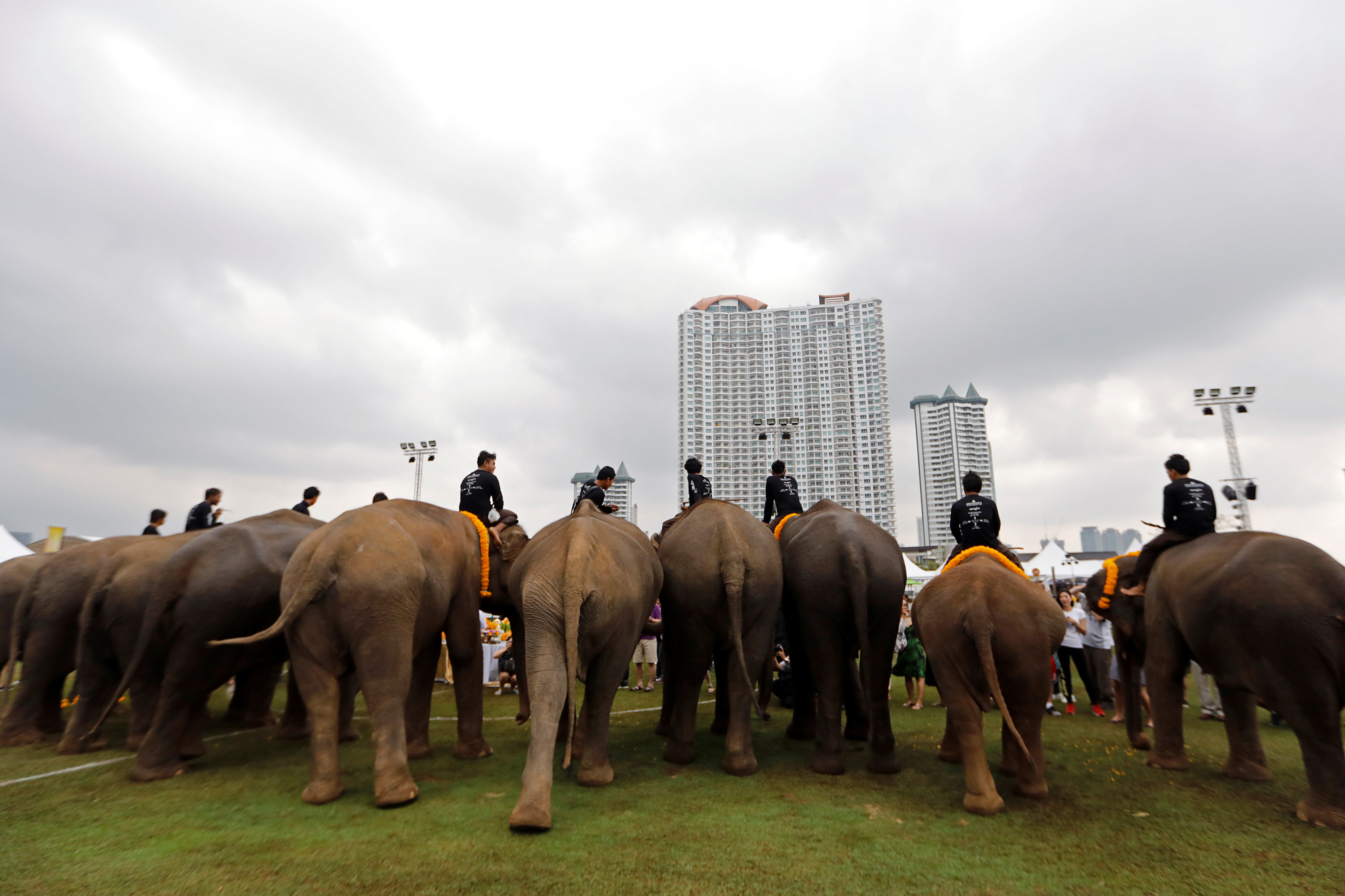 About 30 elephants took part in the opening of Thailand’s annual elephant polo tournament in Bangkok on Thursday.