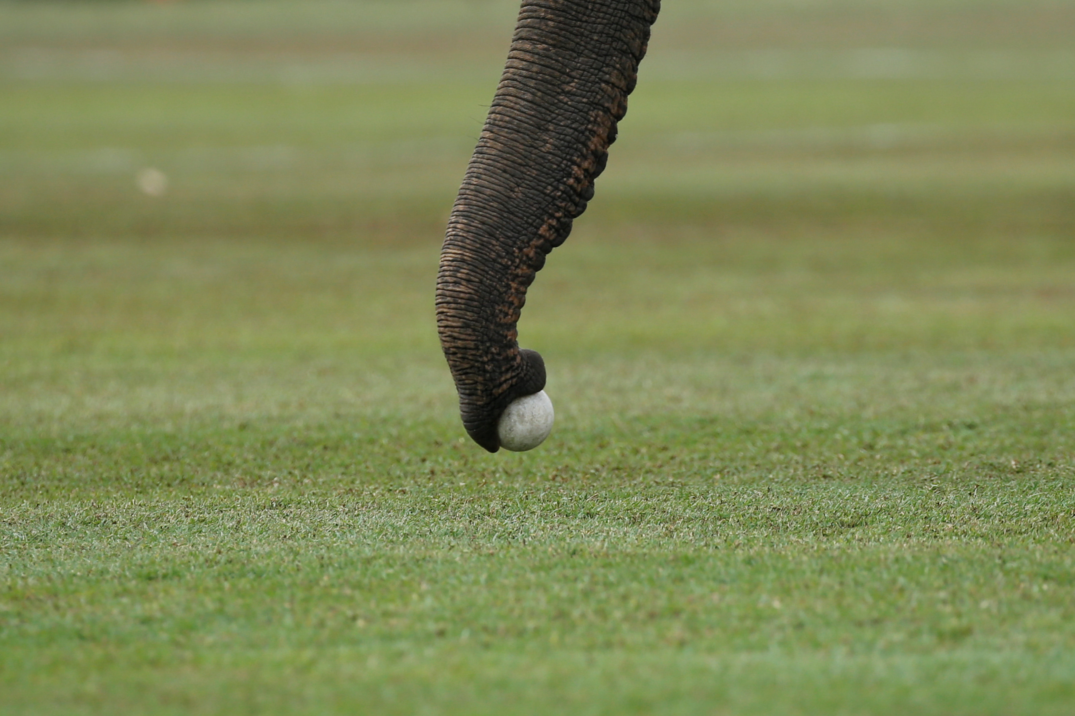 Mahouts handle the elephants while the players try to strike the ball with a stick that is much longer than the one used when playing on a pony. The ball is the same size as a regular polo ball.