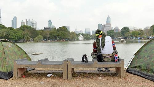 An anti-government protester keeps watch at a campsite in Lumpini Park in Bangkok on Feb 25. Photo: AFP file.