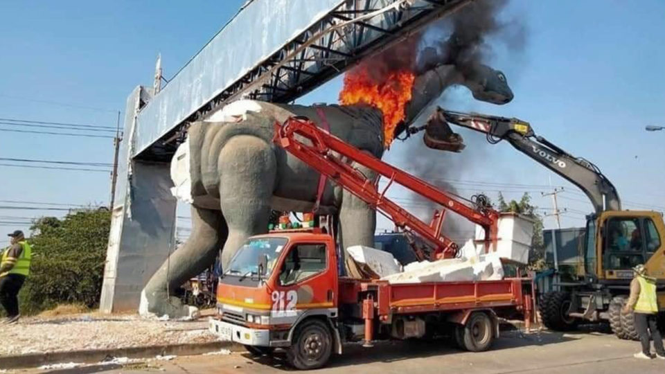 Khon Kaen, Thailand — In this land before time, dinosaurs ruled the earth. Not only did they go extinct, but today saw the added indignity of one consumed by flames during a forced relocation.