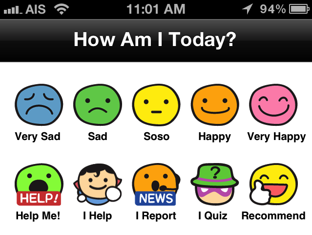 Besides their happiness levels, users can post citizen news reports with the I Report button; recommendations of books/movies/music/whatever with the Recommend button; and stuff for sale with the Selling button. They can also call for help (whatever the problem may be) with a Help Me! Button and aspiring Clark Kents can make themselves available with the I Help button. Users must submit their blood types upon registration and there is a function of the app allows a user to put out a calls for blood donations in the event of an emergency.