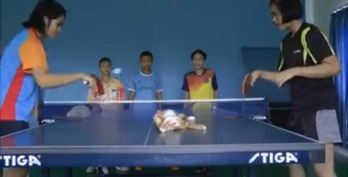 Poong Toh or “big belly,” seems comfortable enough to just lie there as Thailand’s leading table tennis athlete Suthasinee Saewataboot and her opponent slap a backhand volley over his big, lazy body.