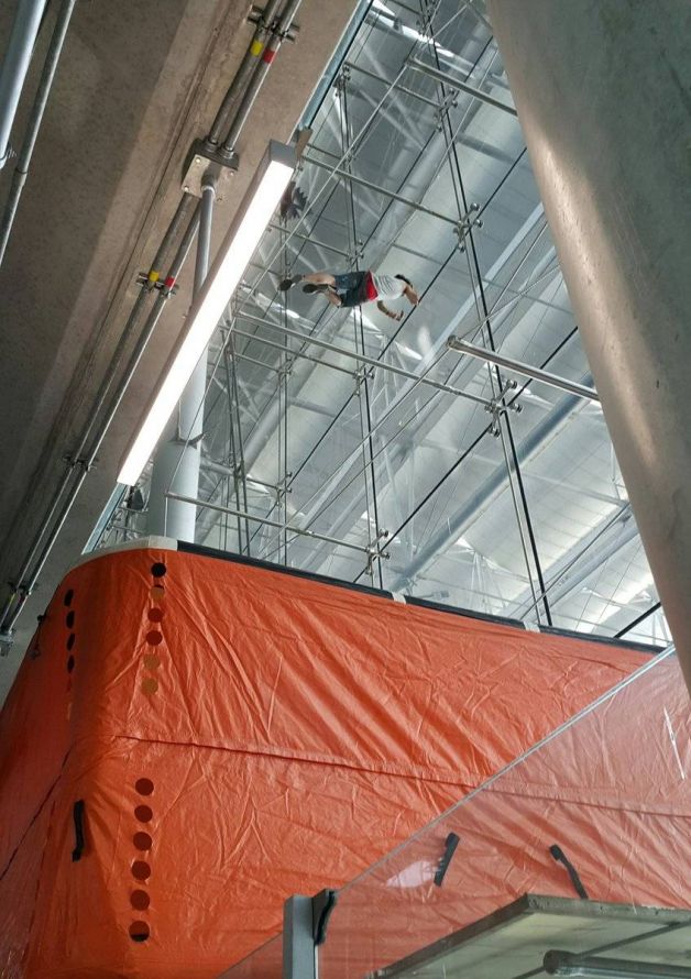 She appears to be between 20 and 30 years old, by the guesses of onlookers, many who seemed quite pleased with — what seemed to be — a challenging gymnastics performance as she moved between several different positions, hanging from her knees as well as from the front of her feet, while dangling from suspended cables near the sixth-floor level — about 20 meters high — near the large glass wall that many will recognize from the passenger terminal, reported Bangkok Post.