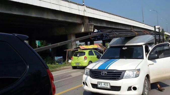 A steel square pipe flew off a pickup truck and careened through the rear windshield of a Toyota all the way to its dashboard console on a highway in Bangkok’s Bang Khun Thian on Saturday.