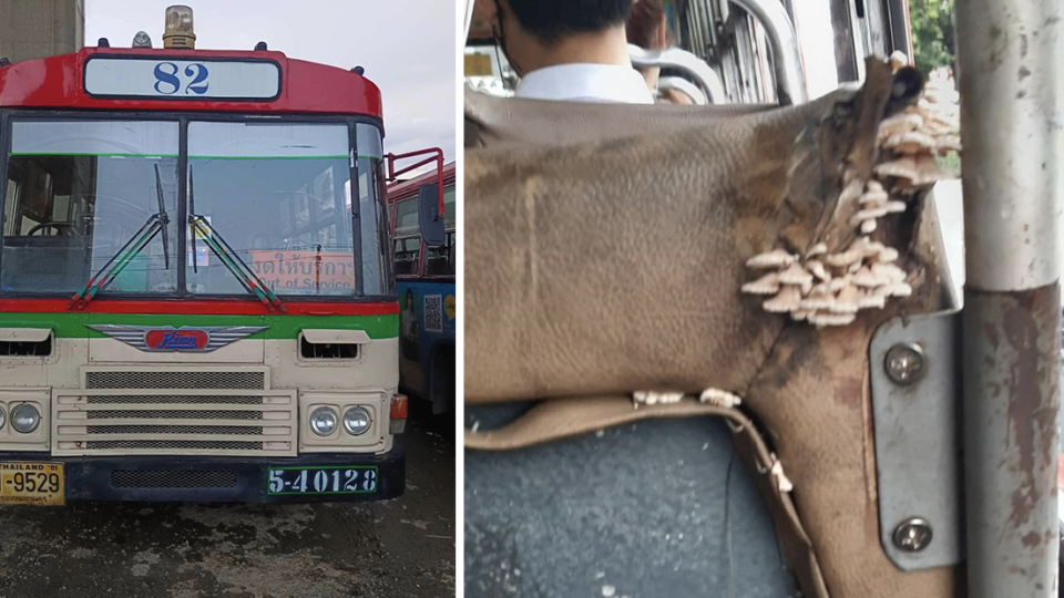 The Bangkok Mass Transit Authority apologized yesterday for the shrooms found growing from a moldy bus seat and said they were removed last night.