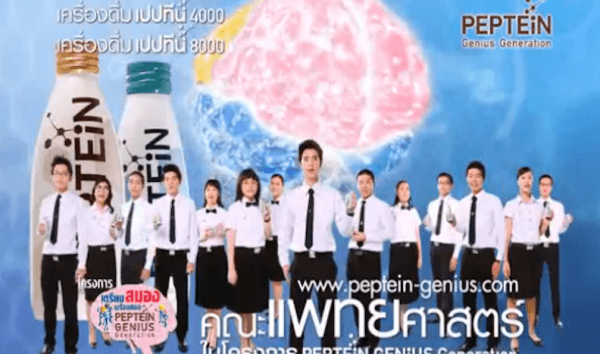 Public record shows that from 2007-2012 Thailand’s FDA fined Osotspa for previous Peptein advertisements that were in violation of regulations. The beverage is sold alongside bottled tea and energy drinks, reports Khaosod.