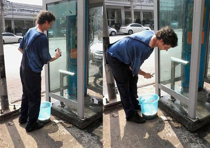 The German man who was photographed in overalls cleaning a telephone booth in Udon Thani province has been praised by the online community for his good deeds today.