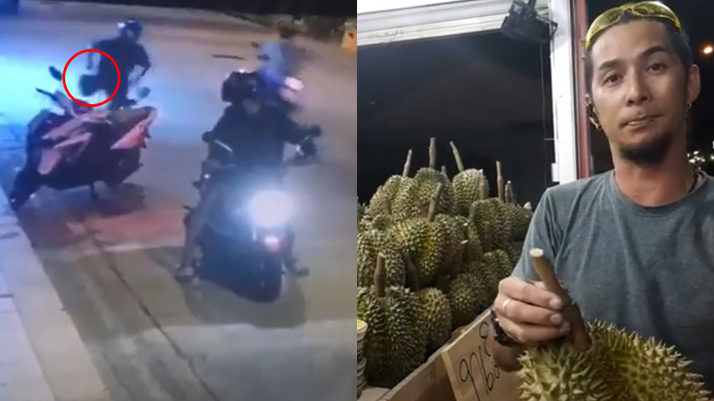 CCTV caught the magic moment last night when a man snatched two durians from a shop in Hua Hin — only to sadly drop one of the smelly treasures as he sprinted back to his waiting accomplice’s motorbike, jumped on, and sped off into the night.