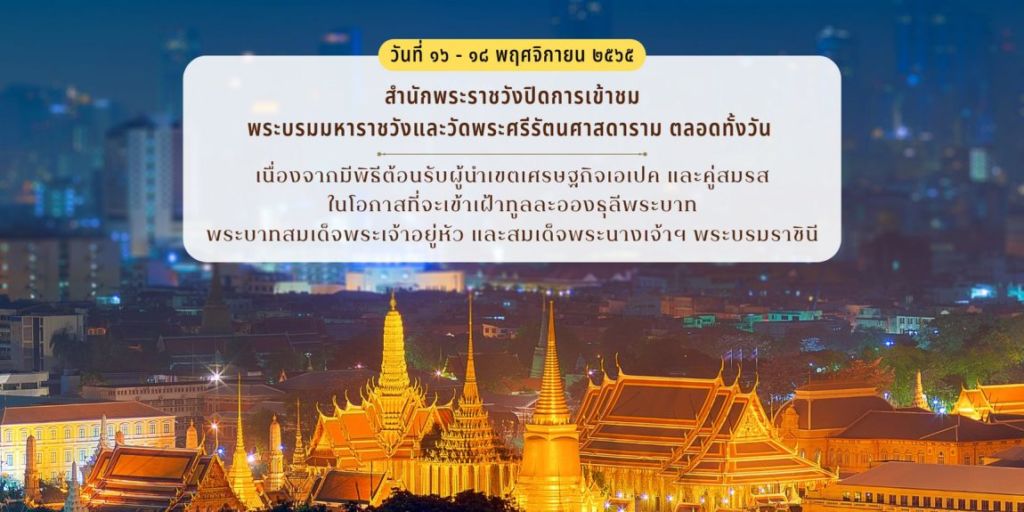 The Bureau of the Royal Household announced today that the Grand Palace will be closed to the public from Wednesday to Friday. The venue will welcome APEC delegates and their spouses, who will be greeted by King Vajiralongkorn and Queen Suthida.