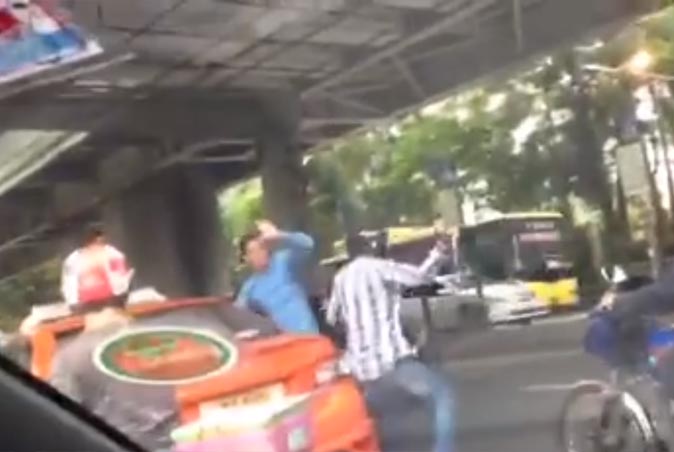 No, nobody knows what happened exactly, but the taxi driver obviously pissed off the motorbike man to the point they got into a verbal melee that culminated in Mr. Moto spitting on taxi’s face. Before you know it, the moto dude loses it and goes full-on kung fury on the taxi, trying to beat him with a padlock attached to a chain, according to user Rock N’ Rolla, who posted the video to great virality this morning.
