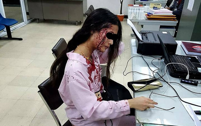 The woman, identified by police as Yodwadee Junsupong, 23, was photographed at Bangkok’s Sai Mai police station covered in blood with a smashed phone and tablet after allegedly being attacked by her boyfriend of seven months, Chonlawit Hiranchatchawan.
