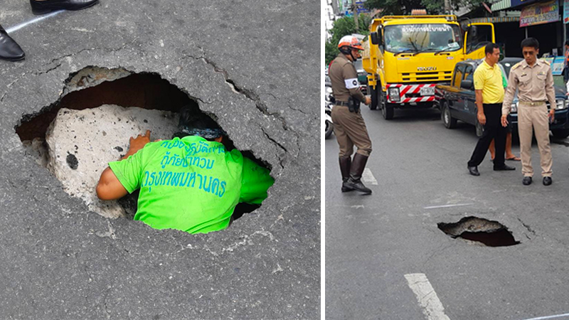 Several minutes after traffic news site JS100 shared images of the incident, city flood control engineer Sunsern Rueangrit added photos of the hole being filled in, saying workers have determined it to be 3 meters across by 5 meters long and 1 meter deep.