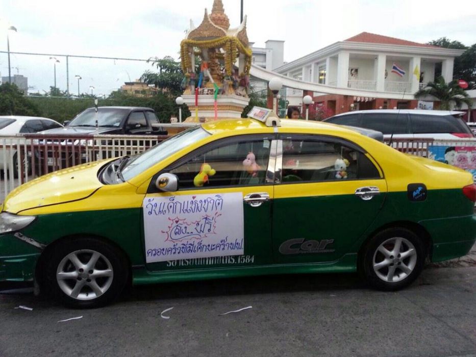 Twitter user @e20ive shared photos of Bangkok taxi driver Noppadol Dewatom who put up signs offering free rides to families on Saturday.