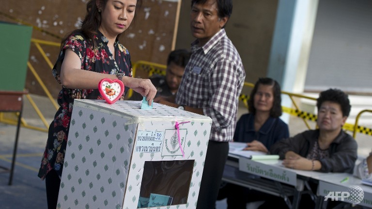Election officials check materials during preparation at a polling station in the southern city of Narathiwat on Sunday, March 29. Photo: AFP