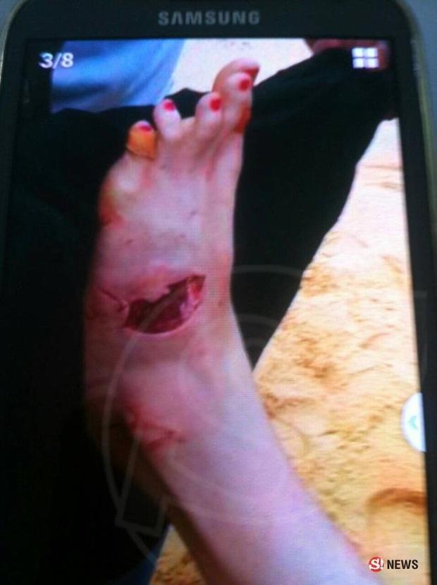 Jane Neame, 37, was swimming at Karon beach when an unknown creature took two bites out of her left foot. She yelled out for help and the lifeguards took her to Patong Hospital.