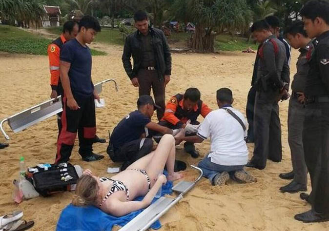 Jane Neame, 37, was swimming at Karon beach when an unknown creature took two bites out of her left foot. She yelled out for help and the lifeguards took her to Patong Hospital.