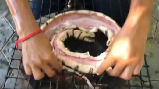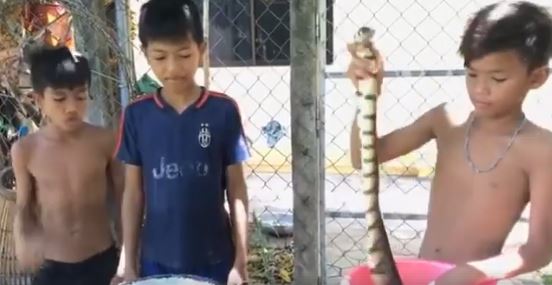 In the 7-minute video, three boys, who all appear to be younger than ten, work together to skin, chop, and prepare a meter-long snake for their midday meal.