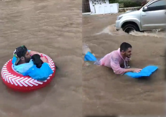 Nothing can dampen the spirits of these two intrepid Brits. Huge flood? No problem! The lads dug out their pool floats and dove into the flood’s mini waves in the middle of road, ignoring the motorists struggling through it around them.