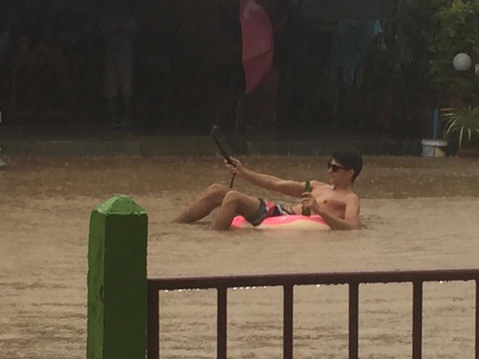 And these two guys aren’t alone in their enjoyment of the flood. Another tourist was caught on camera in a pink tube near Choeng Mon Beach casually sipping a beer and taking selfies while floating through the filthy flood having an awesome time.