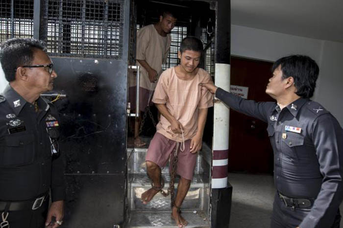 ABOVE: Myanmar migrant workers Zaw Lin (R) and Win Zaw Htun (L) arrive at the Koh Samui Provincial Court on July 8. Photo: Reuters / Athit Perawongmetha