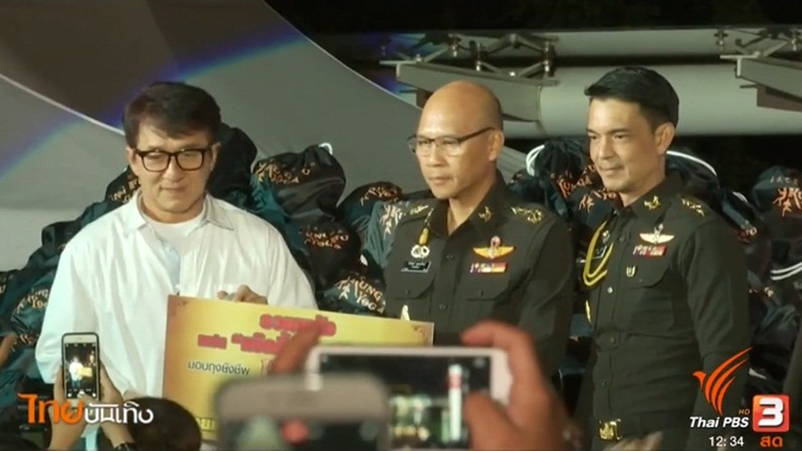 Chan, who now lives in Hong Kong, came to Bangkok Sunday as part of the promotional tour for his new movie, Kung Fu Yoga. After his promotional work was done, he took part in the “Tad Chuey Tai” event that was raising money for the flood victims, reported Thai PBS.
