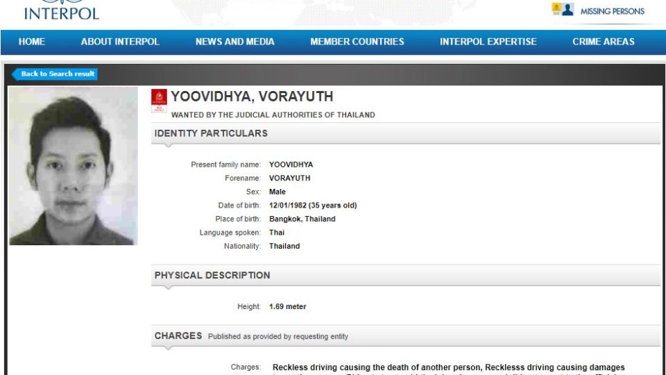 Interpol has officially added an online wanted notice for Red Bull heir Vorayuth “Boss” Yoovidhya in connection with the September 2012 incident in which he allegedly hit and killed a police officer in Thong Lor with his Ferrari and allegedly fled the scene of the crime and, later, escaped justice by leaving the country.