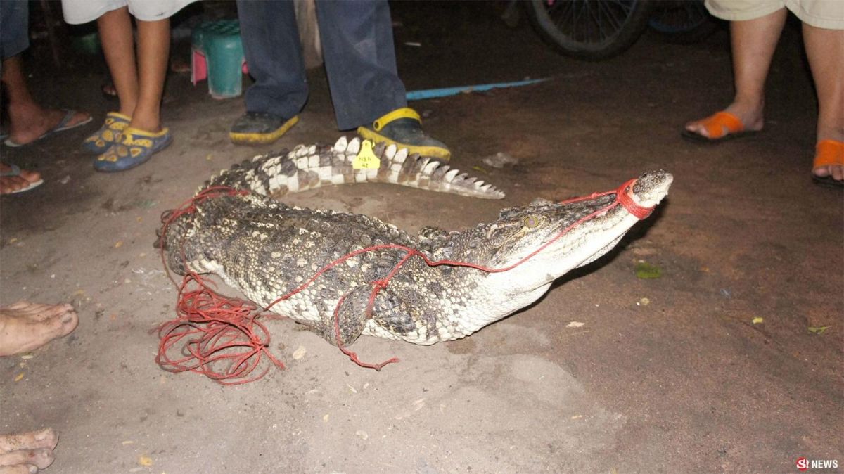 A fresh-water alligator was found happily sunbathing beside the water reservoir that supplies a village’s tap water before getting caught by villagers in Nakhon Sawan province.