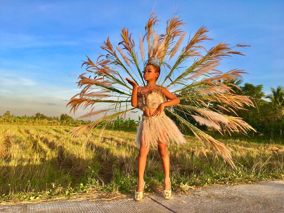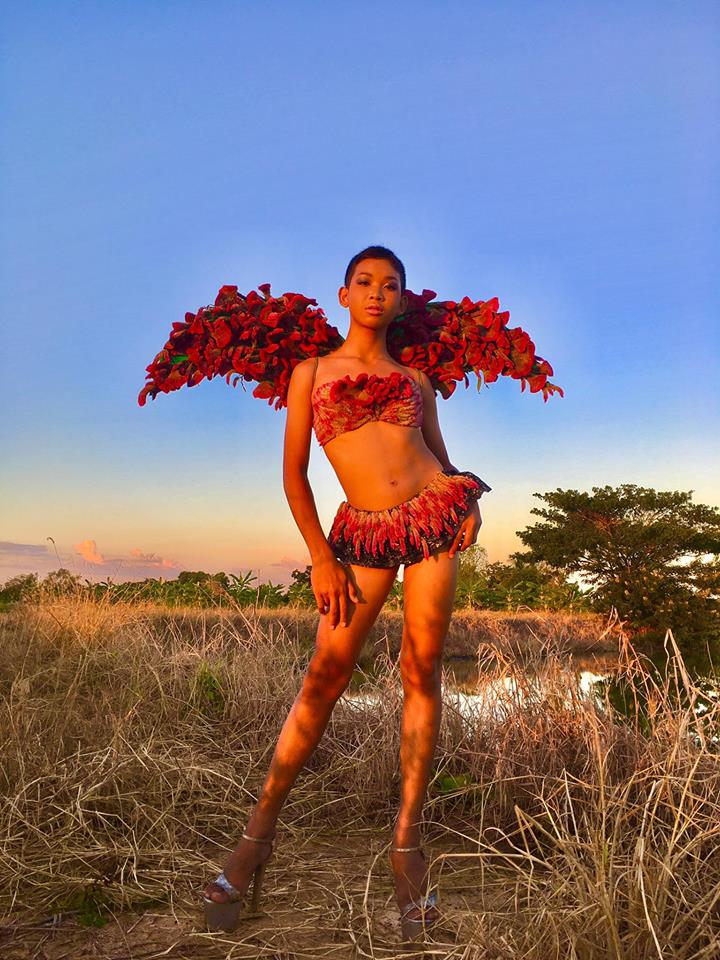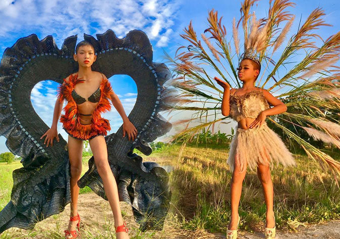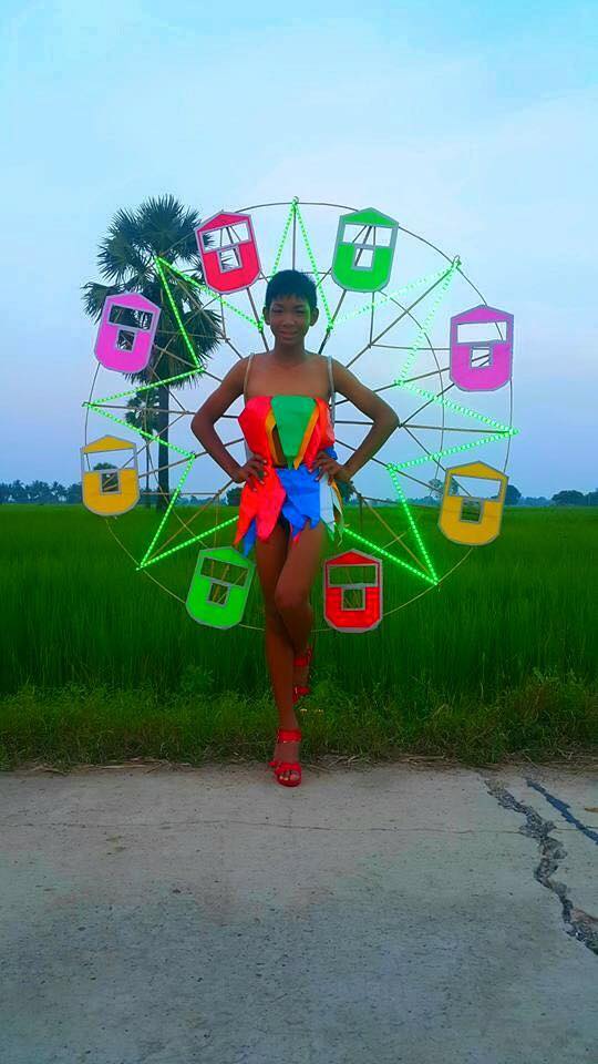 Their costumes are made from objects that remind Thais of all things local: canvas, chicken coops, grass tufts, flowers and leaves. Some dresses represent authentic Thai culture, like a neon ferris wheel that is a symbol of a Thai temple fair, or a jumpsuit made from a colorful traditional sarong.