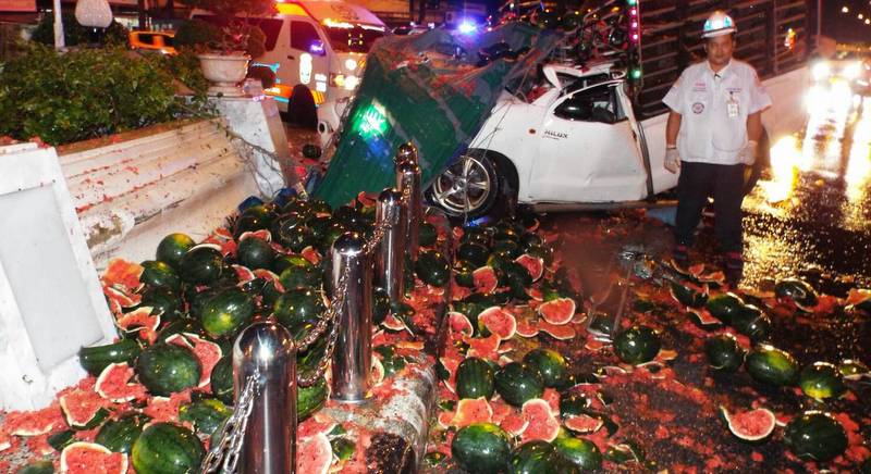 Sarawut said that they were carrying more than four tons of watermelons from Krabi to markets in Patong. It was raining and the road was wet and slippery, and the driver lost control of the vehicle at the monument and hit the barrier.