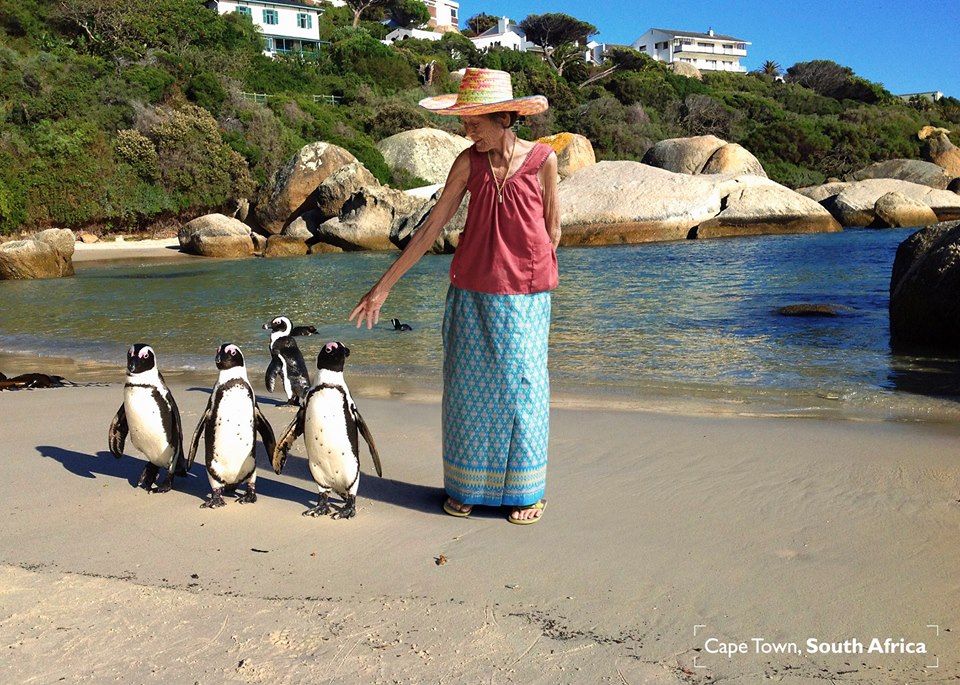 So off she goes, Chub makes his mother pose with the Eiffel Tower in Paris, walk in her trendy sarong at the Shibuya crossing in Tokyo, and interact with penguins in Cape Town.
