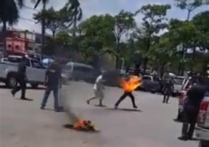 Footage purported to show the man setting himself ablaze at the Pakchong District Office was posted online just after 2pm today by Facebook user Opal Prowpraykarw.