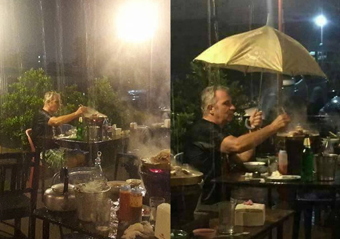 A foreigner in Pattaya ignored his Thai girlfriend’s pleas and lots of weird looks as he continued to dine on outdoor moo ka ta in the middle of a monsoon downpour on Saturday.