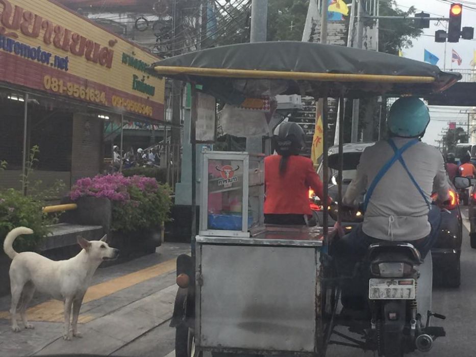 Facebook user Guffie Gift was filming the dog, who obviously really wanted a bite of Khanom Tokyo, but was surprised when the vendor unexpectedly reached for his pancake batter while carefully keeping the other hand on his steering wheel. He made a snack for the cute dog.
