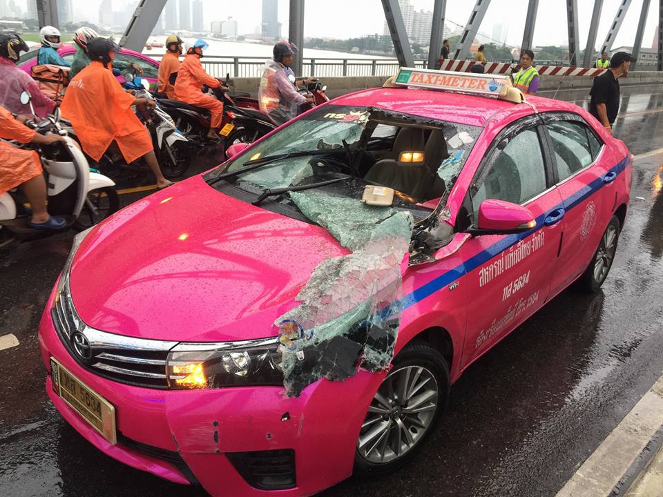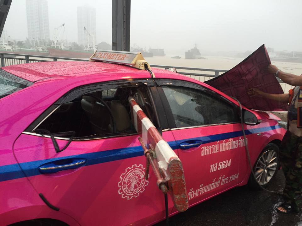 Strong winds this morning caused a metal traffic barrier to strike though a taxi on Krungthep Bridge. The officer responsible for the electric barriers disappeared after the horrific accident.