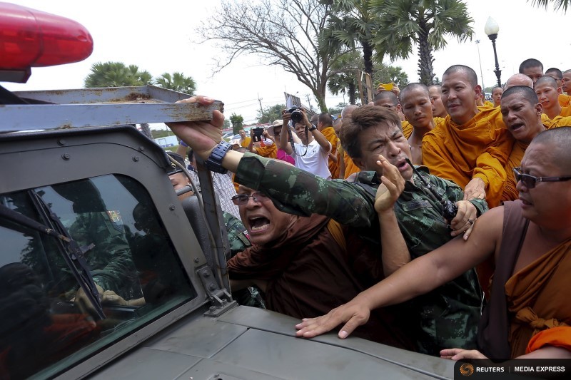“Don’t touch monks!” shouted some of those watching, while some civilians held up placards urging the government to declare Buddhism as Thailand’s national religion.