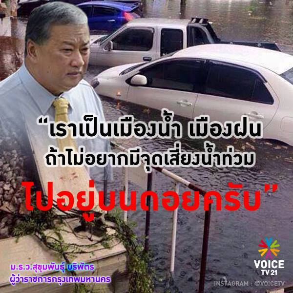 That was the case yesterday when state media trotted out a ready-mix report “Bangkok governor still popular among Bangkokians” after Gov. Sukhumbhand Paribatra told the public they should “move to the mountains” if they’re not okay with the occasional inundation.