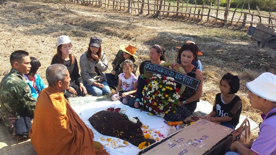 A monk was invited to the Laksi Sheep Farm in Nakhon Phanom province to properly send Jampa to heaven after she was beaten by Noopetch Mokla, 35, who snuck onto the farm while drunk Wednesday night.