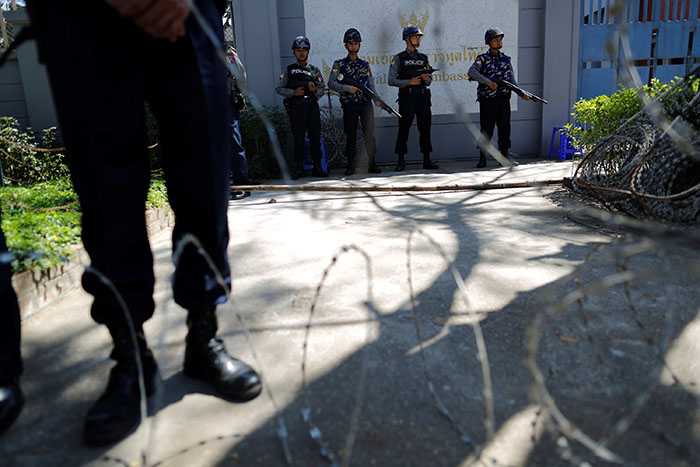 Demonstrators gathered outside the Thai embassy in Myanmar’s commercial hub of Yangon included activists and monks associated with nationalist political groups.