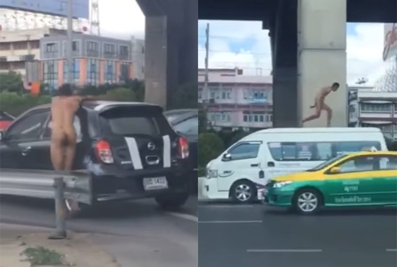 A video, which shows the stark-naked man bashing a car before dangerously running through the street and jumping onto a van, became the talk of town on the weekend.