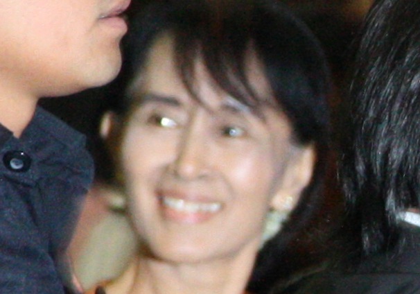 She took her first steps outside the airport at 10:11pm surrounded by handlers and police, and was quickly whisked to a chauffeured BMW. The Lady wore a saffron orange top and a gold skirt and smiled at press and admirers who had waited behind barricades to take photos or catch a glimpse of the momentous arrival of the democracy icon.