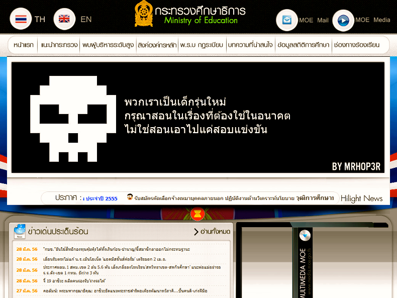 Last night, hacker MRHOP3R hacked the website of the Ministry of Education, requesting that the Ministry incorporate practical knowledge into the curriculum for Thai students.