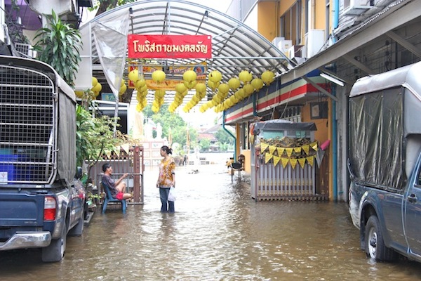 In a surreal scene, the streets of Chinatown near Rajawongse Pier were deserted at 5pm on a Friday night. Where normally there would be a conundrum of food carts, honking traffic, and masses of people finishing work, there was only the occasional worried shopkeeper shoring up sandbag defenses. Water steadily seeped into Song Wat Road, which runs parallel to the river, and by 6pm most of the street was under about a foot of murky brown river liquid. A store on Rajawongse Road was having a big sale of all things flood-related – all at jacked up prices no doubt – and people were lining up to buy boots, boats, and life jackets.