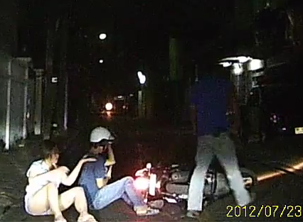 Two people on the second bike fell off and one of them, a woman, is said to have injured her leg.