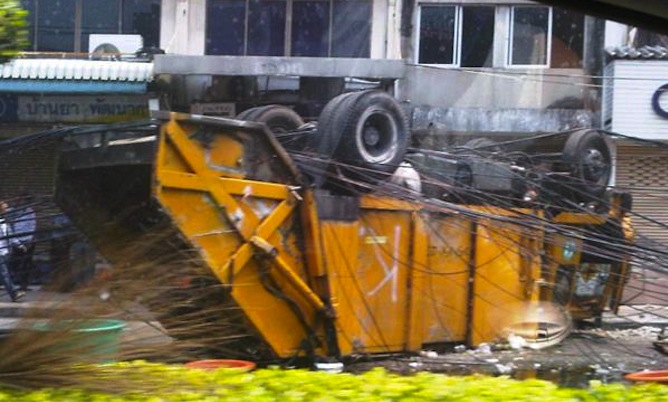 A runaway garbage truck with a drunk driver behind the wheel slammed into roadside trees, flipped, and toppled six power poles at around 3am yesterday morning March 29 on Bangkok’s Pattanakarn Road.
