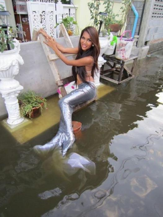 Thais haven’t lost their trademark sense of humour despite massive flooding putting a third of the country under water. Case in point is this photo of a Mermaid o’ the Floods that is going around Facebook now. MerMAN! Crocodiles, snakes, bugs, and now this we have to look out for.