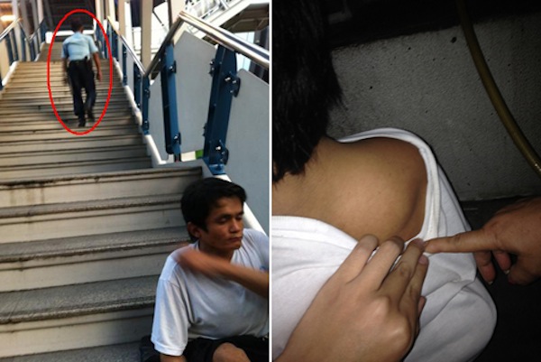 My friend saw a security guard banging his stick on the rail of the stairs and yelling at the man to get out of the station. However, due to his disability he was not as quick as the guard wanted, so the guard beat him with the stick several times on his back and stomach.